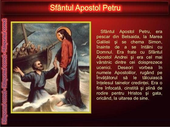 Ghicitoarea G1 De trei ori s-a lepădat De Stăpânul lui legat, Dar, prin lacrimi de căinţă, A-ntrecut orice voinţă. |