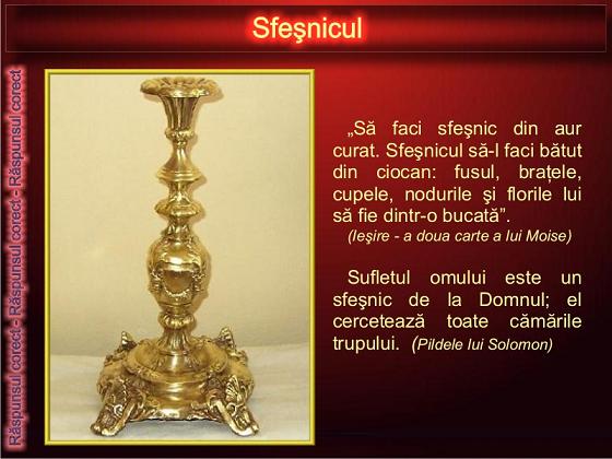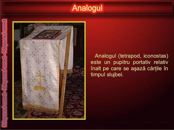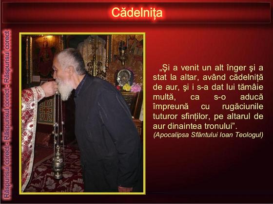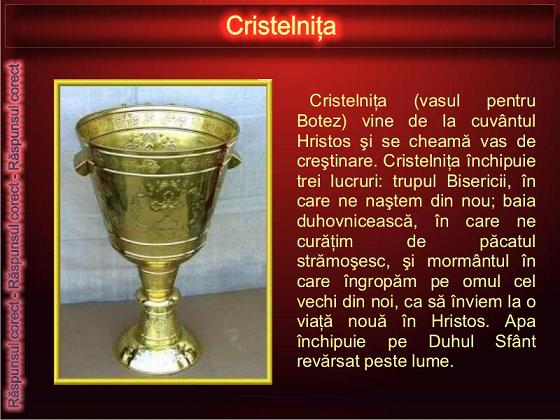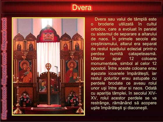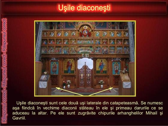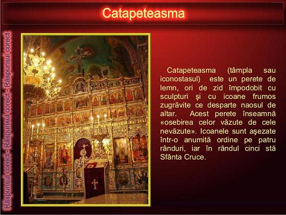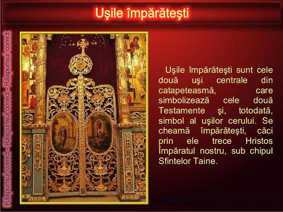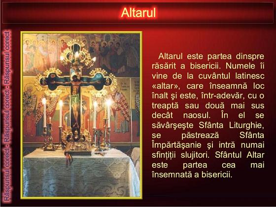 Ghicitoarea I13 Locul cel de răsărit Al bisericii, numit "Sfânta Sfintelor", în care Se petrece-o taină mare. |